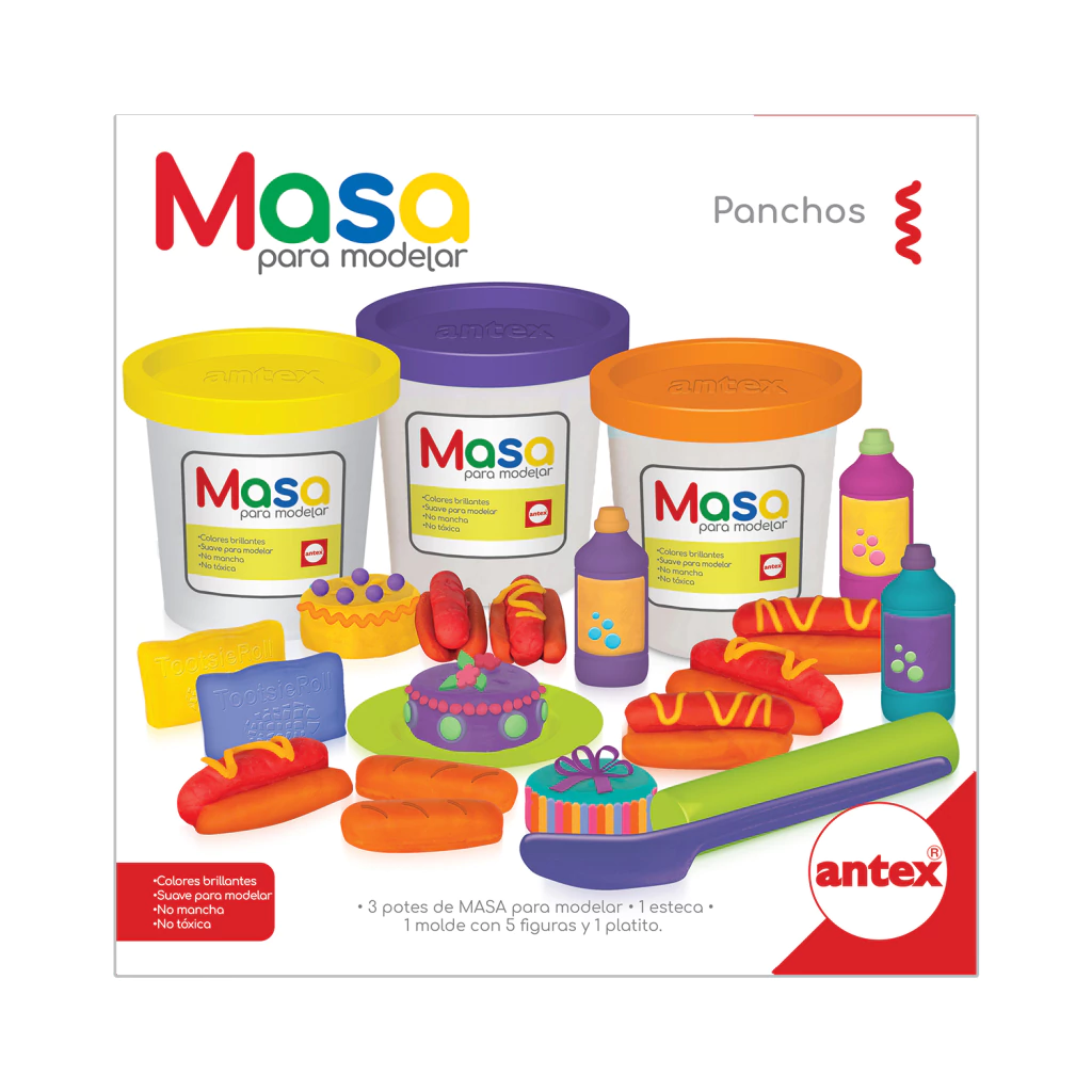 Incluye 3 potes de masa, 1 esteca, 1 molde con 5 figuras, un platito y una bandeja