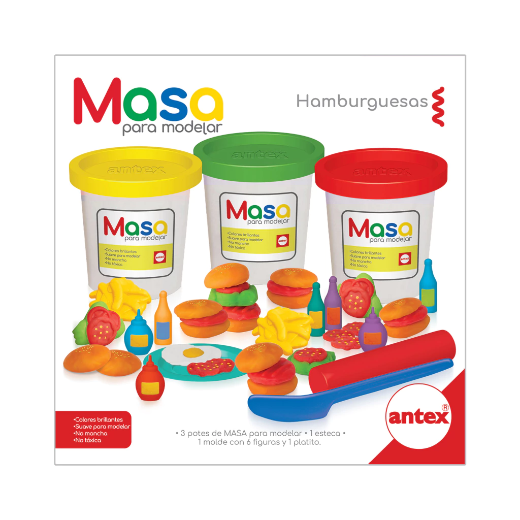 Contiene 3 potes de masa, un palito de amasar, un molde con 5 figuras y 2 platitos