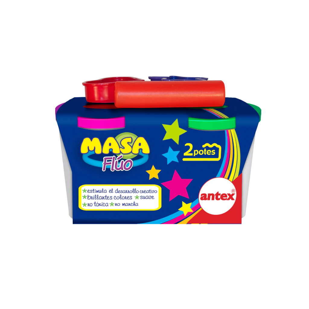 incluye 2 potes con masa fluo con diferente colores divertidos + moldes y palito de amasar.