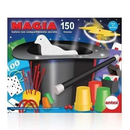 Magia 150 trucos con galera Equipo completo para realizar tu propio show de magia. Incluye manual ilustrado. Artículo: 5001 Edad: +6 años Tamaño: 30 x 25 x 24 cm Forma de envió: Mercado envíos Forma de pago: Mercado Pago solo hacemos factura B - Consumidor Final.